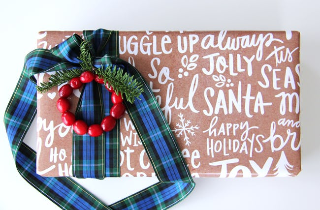 A great way to bring a little seasonal cheer to your gifts is by incorporating elements of nature. A Pretty Life in the Suburbs suggested stringing fresh cranberries on flexible wire like a mini wreath to add a festive touch to your presents. You don't have to stick with cranberries, of course.