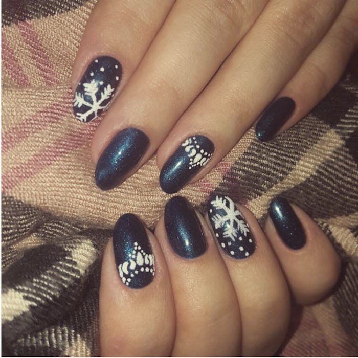 With a navy blue that twinkles like a crisp winter night with snowflakes in the air, you'll just want to wrap yourself up in your warmest flannel when you're wearing this cozy and wintery mani by nailspapoland.