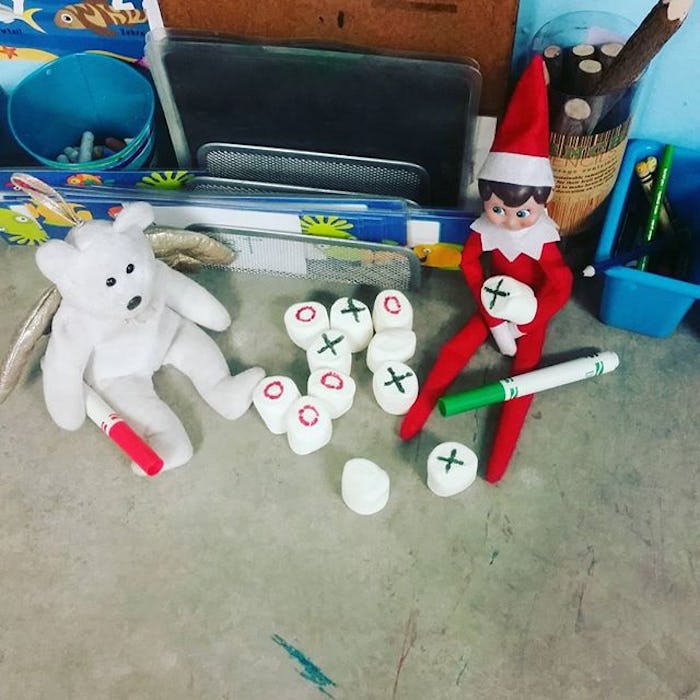Mini marshmallows and a marker put your elf in a gaming mood with your kids' favorite toys. Have the Elf make another set of tic tac toe marshmallows for your kids to play with!