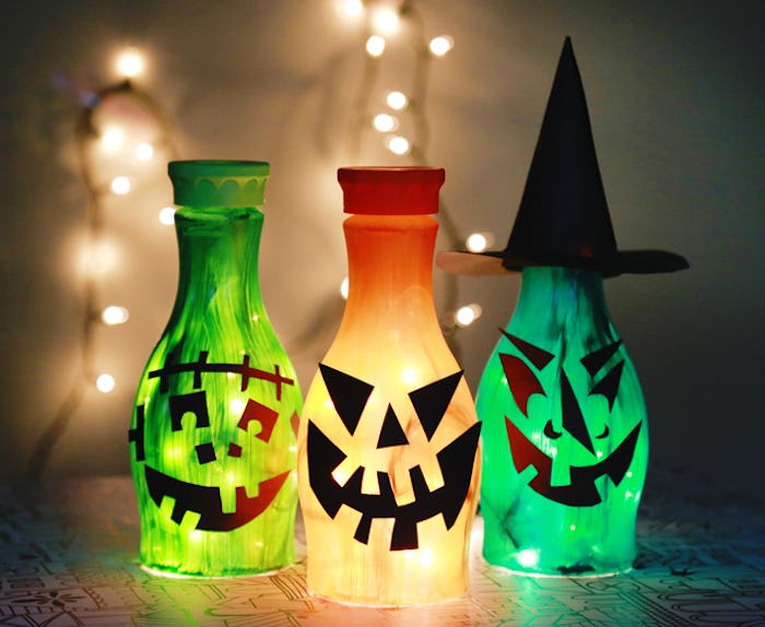 Using paint and upcycled juice cartons, Aunt Peaches has an adorable Jack-O-Lantern-esque Halloween tutorial that you don't want to miss. Pair these with a string of white holiday lights, and you've got yourself a spookalicious tableau.