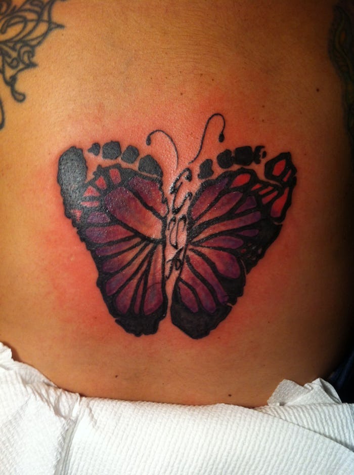 Some loss parents have memorialized lost babies with a tattoo of their footprints taken at birth. This butterfly tattoo includes footprints of both twins to honor their special bond.
