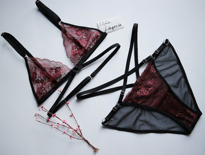 The mulled wine lingerie set ($45) from Etsy seller ElphinLingerie is a made-to-order set that features lace and mesh detailing in a gorgeous hue. The straps mean everything is adjustable for a perfect fit.