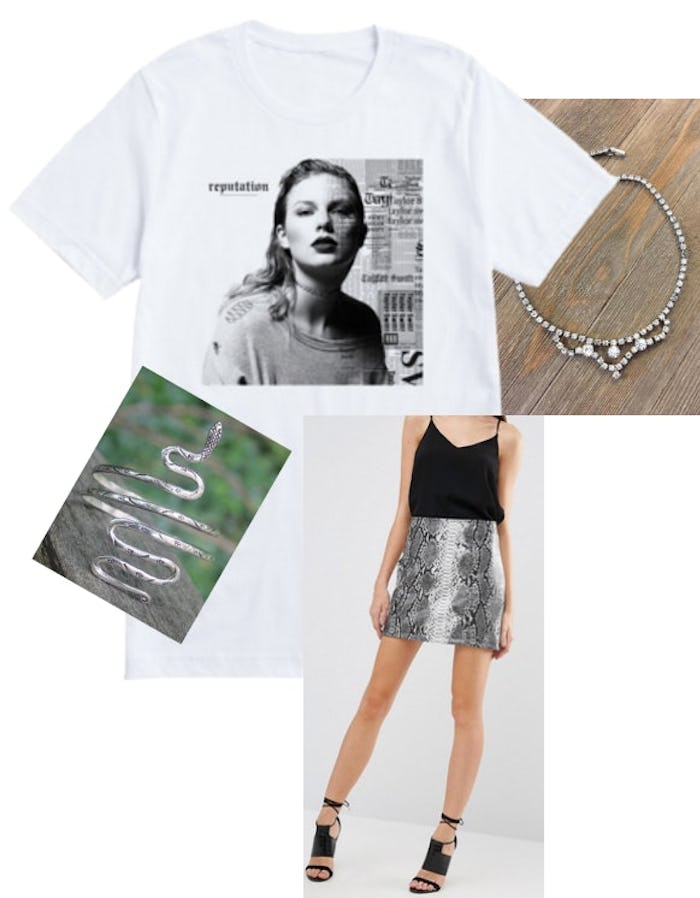 If you've listened to "Look What You Made Me Do," then you know the news: the old Taylor Swift is dead. Channel the snaky new Taylor, or any of her past incarnations, for Halloween this year. For Reputation-era Tay, go for an album cover t-shirt ($45, TaylorSwift.com), a snake arm cuff ($20, Etsy), and a snake print miniskirt ($15, ASOS). A rhinestone costume necklace ($10, Etsy) channels the music video scene where she bathes in diamonds.