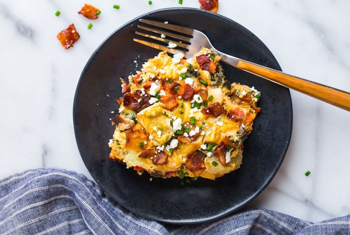 This crockpot egg casserole by Well Plated is a super easy way to feed all of your guests for Mother's Day brunch. Between the bacon, two types of cheese, bell peppers, artichokes, shallots, and a pinch of cayenne pepper, this dish is sure to garner plenty of compliments for its tasty appeal.