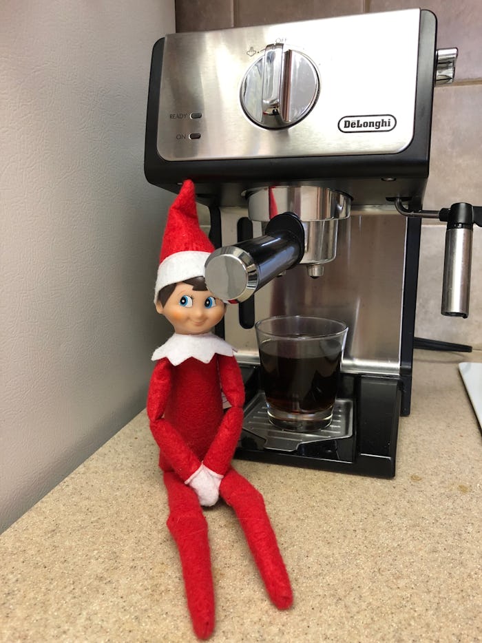 Okay, full disclosure, this one is from my house. We have a long-running joke that 'mommy can't function without her lattes,' so I decided to get our Elf on the Shelf in on the espresso action and let it play barista.