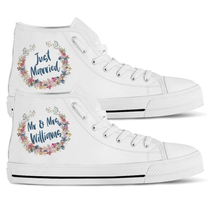 Your wedding day might feel like it goes by in the blink of an eye, but in reality, it's hours upon hours of standing on your feet. If you're not into the idea of being in agony by the end of the night, you might want to pick sneakers instead of stilettos to complete your bridal look. And why not? You can even order a pair of personalized wedding sneakers that will keep you comfy while also incorporating your personality into the festivities.