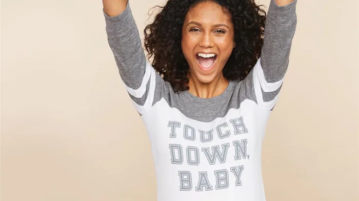 While you're daydreaming about all the food you're going to eat on during the big event, pick out a football-themed, bump-friendly shirt to get you in the spirit.