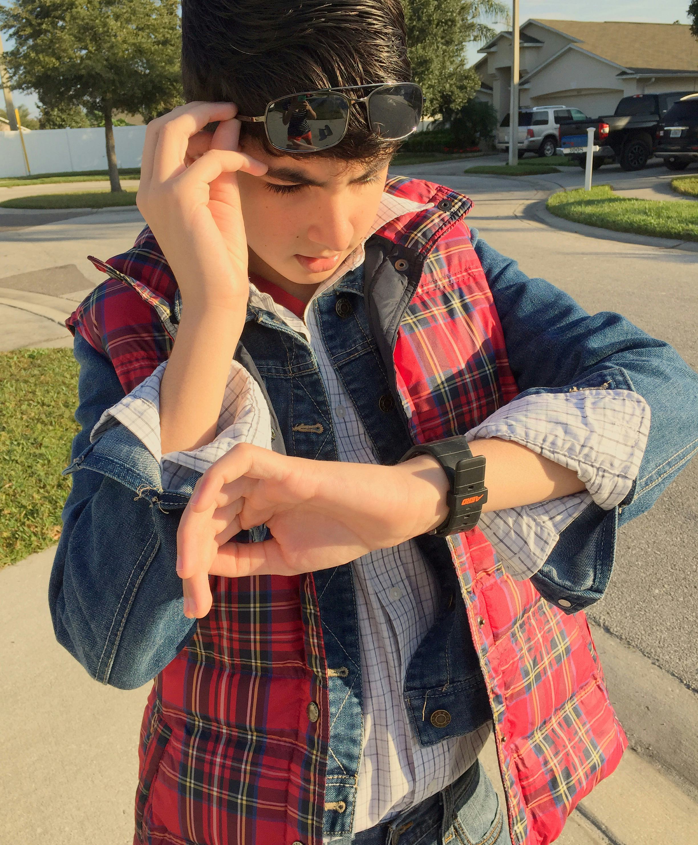 The key to a perfect Marty McFly is layers. Marty wears a puffer vest over a denim jacket, over a button-down shirt, over a red T-shirt and jeans. We picked up the vest, denim jacket and button-down shirt at a thrift store for about $15 total, and my son wore his own jeans, red tee shirt and sneakers.