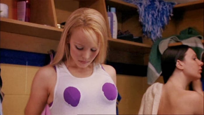 You know what else works great for breastfeeding? Cutting holes in your shirt, conveniently located over both boobs. This makes Regina George from Mean Girls the perfect Halloween costume for easy breastfeeding. Simply wear a black skirt, a colorful nursing bra, and a white tank top with a holes cut over each breast. Easy access!