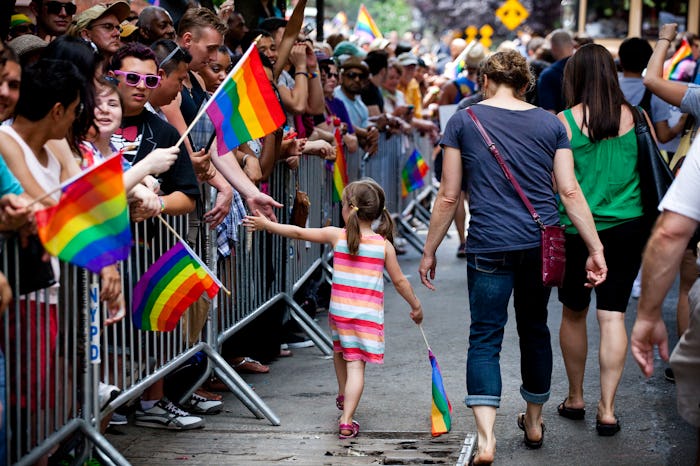 If you're planning on taking your kids to any Pride Month events this year, giving them signs of their very own to carry is an excellent plan: Not only are kids carrying signs ridiculously cute, but getting them involved in the process of choosing the right quote and turning it into a colorful placard will make the entire experience a lot more meaningful, too. It's never too early to start teaching our little ones tolerance, inclusivity, and love above all else. So what are some great pride sign ideas for kids that they'll both understand and have fun waving... with pride?