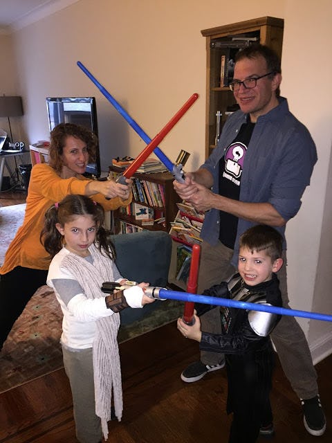 For starters, we showed the kids the first trilogy when they were young. Like, really young, as in before my older one could read. That’s quite a commitment, if you think about it and if you ask me. Reading the scrolling text in the prologues of each film out loud with every screening (and there have been many) is a major time investment. My husband and I both entered our relationship, over a decade ago, with our own Star Wars paraphernalia — action figures, books, branded coffee mugs — and having kids means we’ve only added to our collection over the course of birthdays and holidays. By “holidays,” of course, I mean Mothers’ Day when the kids gifted me with a Princess Leia bobblehead one year. I mean, they're just the best.