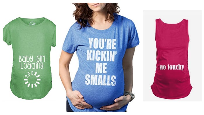 Plus, some moms just want a shirt that straight-up addresses the pregnancy. It's one way to avoid awkward conversations with strangers, because the shirt confirms the fact that you do, indeed, have a baby on the way. Some even warn others not to touch your bump — really, a few moms I know would appreciate these tops for every pregnancy to come, or at least until the "no-touching-random-pregnant-women" idea finally becomes more mainstream. (Don't hold your breath). Until then, here are some hilarious maternity shirts that will surely get a laugh.