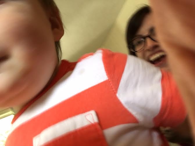 Yes, I was trying to somehow make the concept of a candid selfie work, and yes, I now understand that it's impossible. But, at least I got this cute image of my son laughing so hard he's blurry, so.