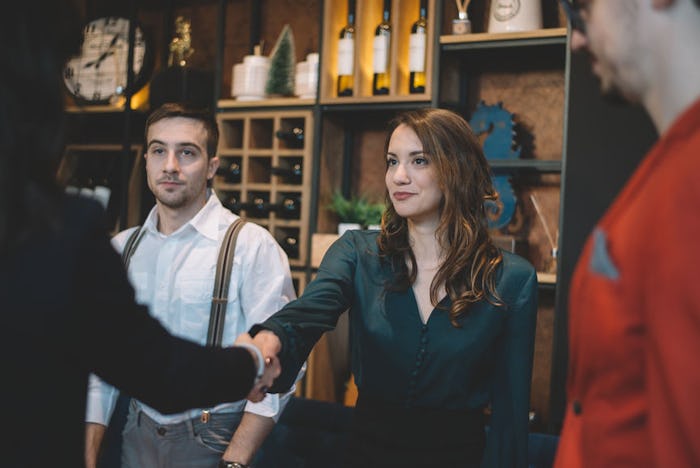 When you're meeting someone for the first time, it's polite to stand up for the initial handshake and hello. "Standing up sends a signal from across the room that you’re willing and eager to greet and welcome the other person into your here-and-now. It speaks well of you even before you’ve had an opportunity to say your first word because it shows by your action that you’re a welcoming person," wrote Maralee McKee, the founder of Manners Mentor, on her website. It's just a little way to make the other person welcomed and included.
