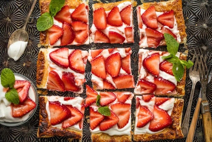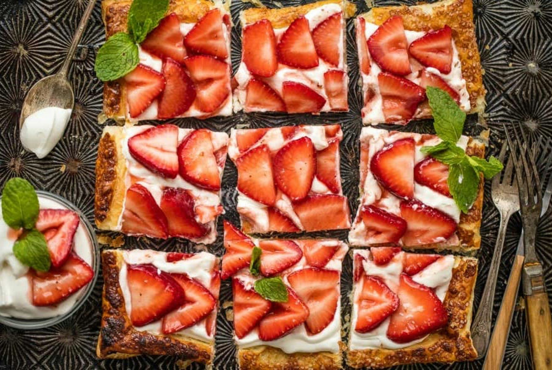 Strawberry jam, mascarpone cheese, and whipped cream combine to make the filling that is slathered over the top of a baked puff pastry and topped with fresh strawberries to create this strawberry tart by My Baking Addiction. Make it and serve it right in your sheet pan so that your guests can enjoy a fresh, summery dessert at the next birthday party you host.