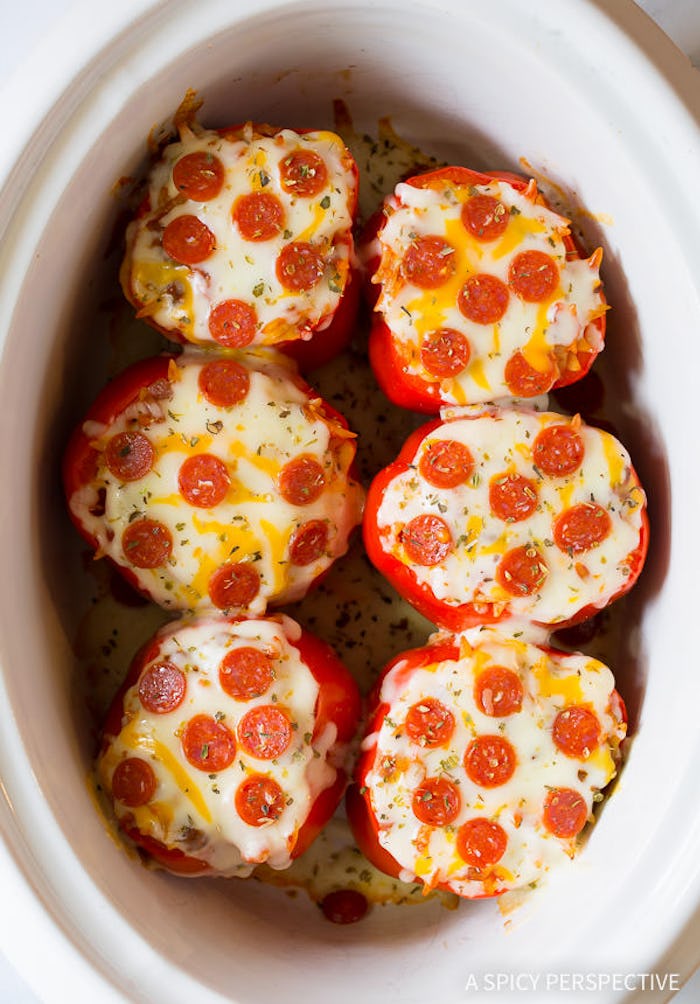 So many things you want to eat are hiding in these pizza stuffed peppers (which take about 3 hours on your slow cooker's high setting): orzo, sausage, onions, sauce, and of course cheese, cheese, and more cheese.