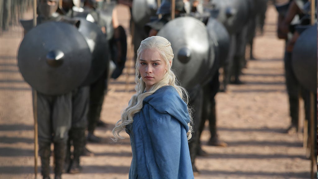 The events happening in Westeros on Game of Thrones was initially referred to as the "War of the Five Kings." Joffery, Stannis, and Renly Baratheon, Robb Stark, and Balon Greyjoy are all vying for crown and kingship following the untimely death of Robert Baratheon. But now, depending on whether you go by the books or show, only one or maaaybe two of the original five kings remain. One contender, one no one really counts on in the Seven Kingdoms, is still very much in the running: Daenerys Targaryen, the First of Her Name, Queen of Meereen, Queen of the Andals and the Rhoynar and the First Men, Lord of the Seven Kingdoms, Protector of the Realm, Khaleesi of the Great Grass Sea, called Daenerys Stormborn, the Unburnt, Mother of Dragons. *whew*