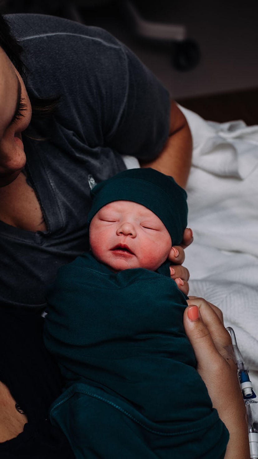 These two mommas are getting a good look at their little one. Kayla Serr lies on a hospital bed following her C-section, while wife Chelsea holds their daughter to Kayla's chest. Both Kayla and Chelsea stare at their newborn, while the little one looks up at the camera. We see what the moms see.