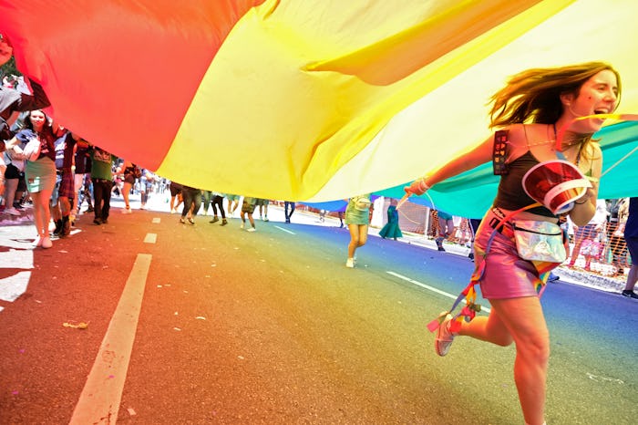 Why are rainbows associated with LGBTQ+ pride? The original rainbow flag was designed by gay rights activist Gilbert Baker in 1978, according to NBC. It’s been suggested that he was inspired by the “Flag of the Human Race,” a flag of horizontal striped bars that called for unity and peace amongst all races. The first version of the flag consisted of eight rainbow colors, with meanings ascribed to each: hot pink (symbolizing sex), red (symbolizing life), orange (healing), yellow (sunlight), green (nature), turqouise (art), indigo (serenity), and violet (spirit). The flag was eventually simplified to the traditional six colors more commonly used today. And actually, there are many other flags associated with pride that specifically denote different orientations, identities, and genders. Here’s a comprehensive list of pride flags to familiarize yourself with.