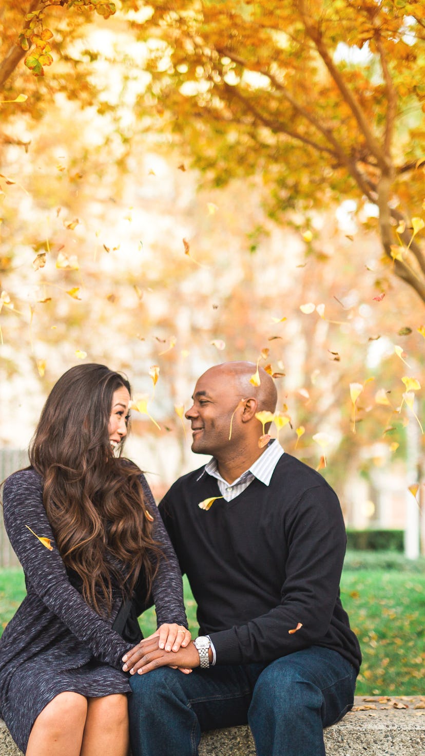 In this picture taken by Clair Chang, a family of four bursts with joy while celebrating Mom and Dad's impending nuptials. The couple sits on a bench in the middle of the frame, grinning at each other and holding hands. Their daughter and son stand on either edge of the bench, gleefully throwing up leaves in place of confetti. Each of them sports an infectious smile, and the excitement is palpable.
