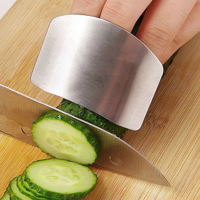 Slip this stainless steel finger shield protector on like a ring so that it protects your skin from cuts when you slice, dice, and chop your veggies and meat. The shield, which is adjustable to fit your fingers, is dishwasher-safe and can even help you keep things like cucumbers or zucchini stable for easier cutting.