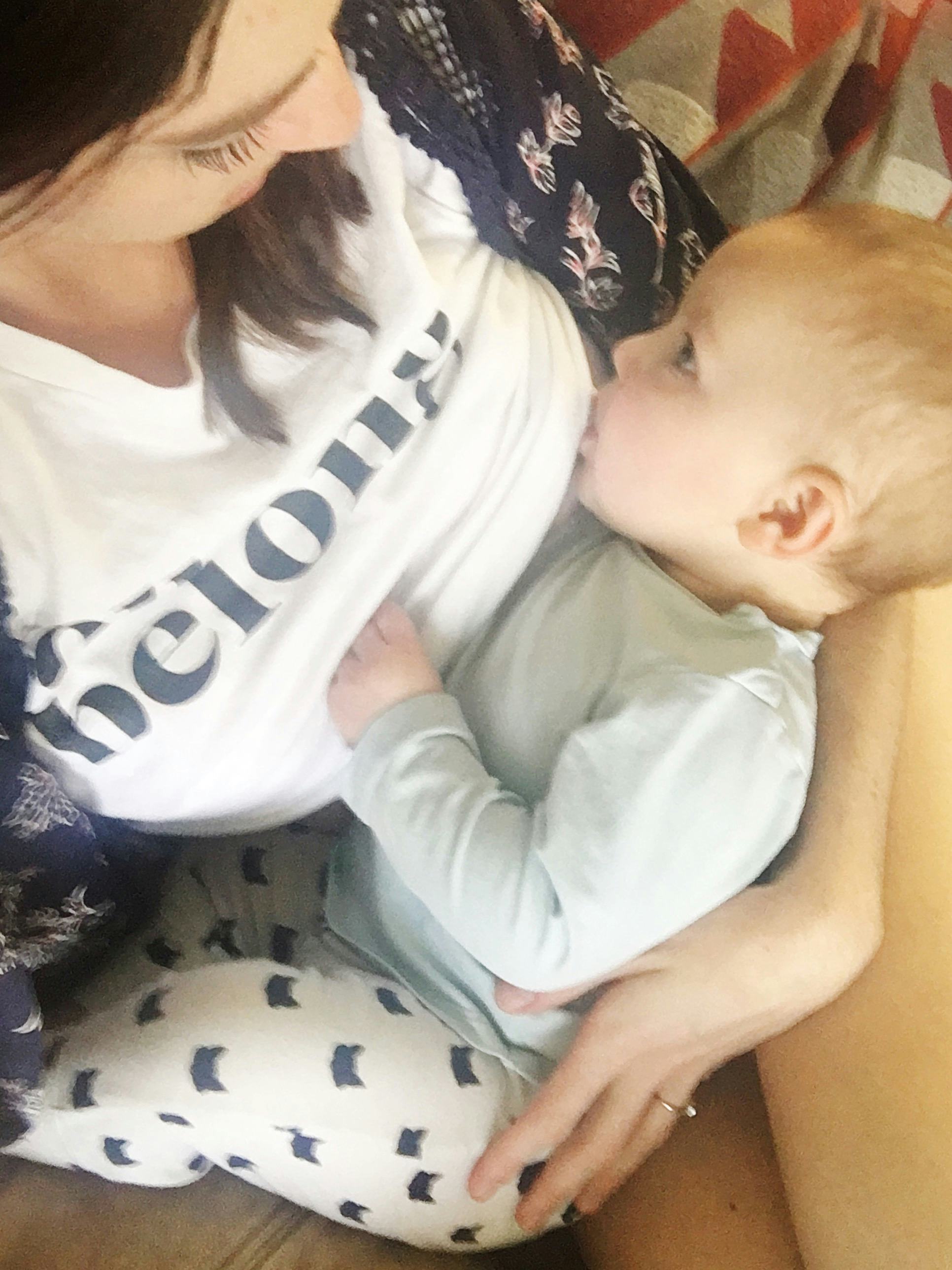 By far the most popular hold, the cradle hold is perfect as your baby gets bigger. Simply hold your child with the same arm as your nursing breast. In this photo, I'm sitting with my legs propped up underneath my daughter to give a little extra support (those babies get heavy after a while).