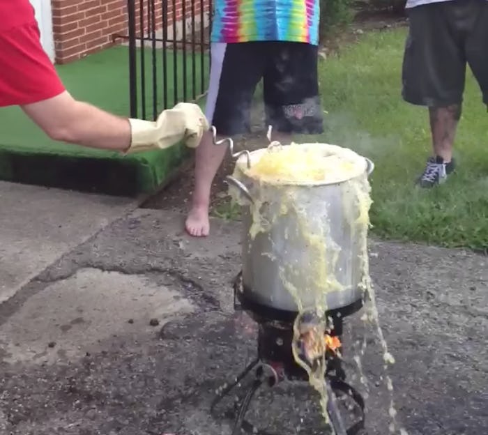 Although the build up is long, these guys quickly realize that they used far too much oil. Although nothing caught on fire or exploded, it could have been much, much worse, as everyone else with their phones out seemed to realize. We also learn an important lesson here: Wear pants. Extra props to the man in tie dye who isn't even wearing shoes.