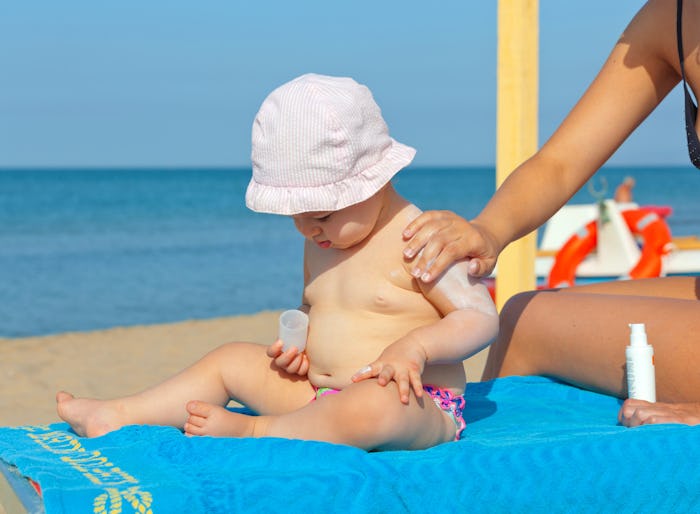 If your baby is older than 6 months, you'll want to vigilantly apply an SPF of at least 30 every two hours, according to the Mayo Clinic. But before you smear on the 'screen, you'll want to scour the label. "I prefer natural sunscreens that are mineral-based, using non-nanotized zinc or titanium. Although such preparations are more whitening and don't rub in as easily, they are less likely to be absorbed into the skin and felt to pose less harm overall," explains Dr. Sarina Elmariah, MD, PhD, of the Department of Dermatology Massachusetts General Hospital.