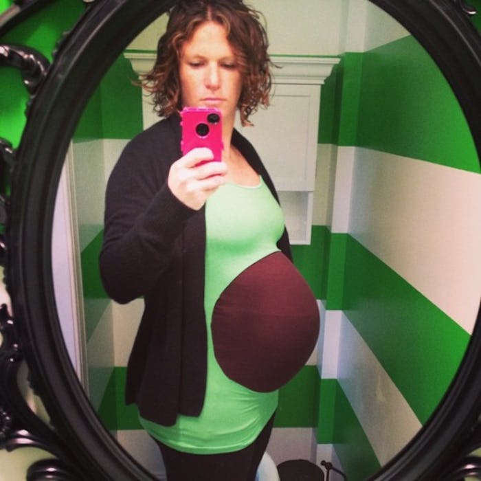 Layering a fitted green top with the belly cut out over a fitted brown tank as Julianne Smith of The Garter Girl did is just one clever way to get your avocado on this Halloween, but of course there are many other ways to pay homage to this popular fruit. And whether you're a fan of the fruit or not (yes, I had to Google whether or not every millennials' favorite food was a fruit or a veggie), you have to admit that it's conveniently shaped quite similarly to your growing bump, and can be as easy as whipping up a serving of avocado toast.