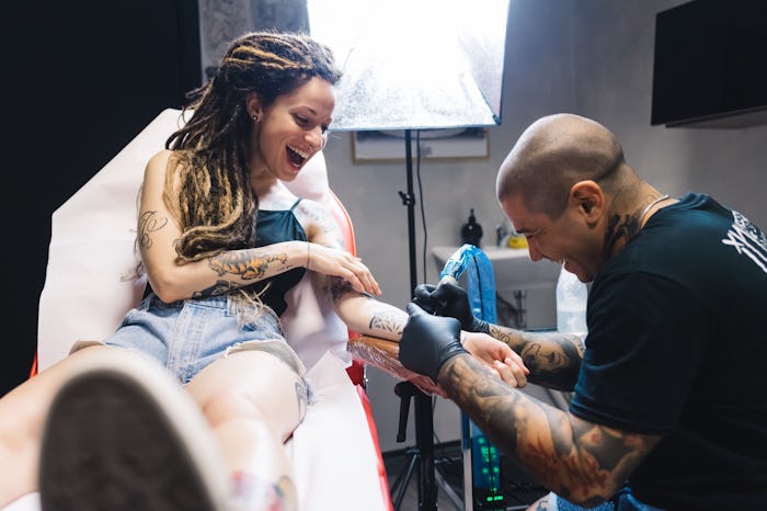 Although more and more people are going under the tattoo machine these days, the way the body reacts to tattooing in the moment is still mysterious. To learn more, Romper spoke with Dr. James Giordano, Professor of Neurology at Georgetown University Medical Center in Washington, DC. Because his research examines the neurological processes of pain and pleasure, he served as an excellent resource for this piece. Basically, tattooing affects the body and brain, and it can also be a deeply personal outlet for artistic expression. With so many factors going on at once, getting tattooed is anything but simple.