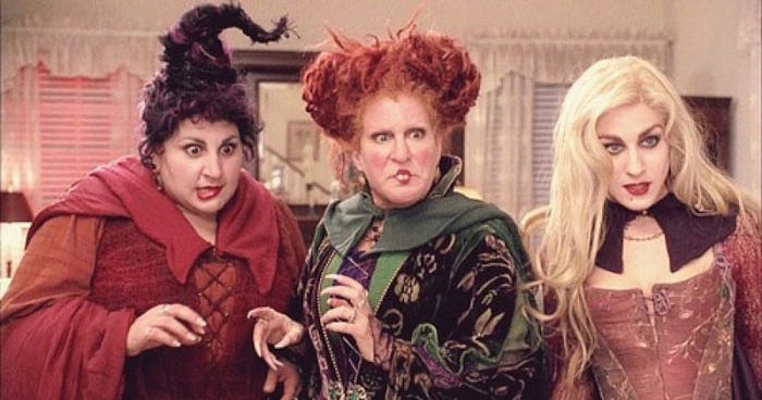 The film Hocus Pocus of course stars Sarah Jessica Parker (the Carrie witch), Kathy Najimy (totally the Miranda witch), Bette Midler (Samantha witch, obvs), and Doug Jones (Charlotte witch), and is a goofball tale of the Sanderson sisters: three witches who were hanged to death during the Salem witch trials, but who manage to come back 300 years later to wreak havoc on Halloween.