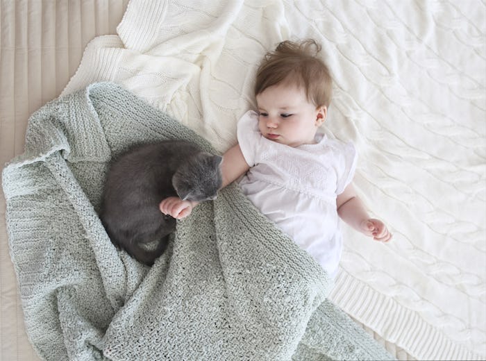 As a new mom worried my fur babies and my human baby wouldn't get along, I relied heavily on all the studies that said having a pet would ultimately be beneficial to my child's wellbeing. But as the postpartum days crawled by, I started to doubt whether or not my cats — and particularly the youngest one — would ever learn to live with my baby in harmony. Then, before I could panic too much, I started to notice some small signs that my beloved pets were falling in love with my precious child. So if you have a reluctant pet, fear no more. Here are some subtle signs they're actually falling head over heels:
