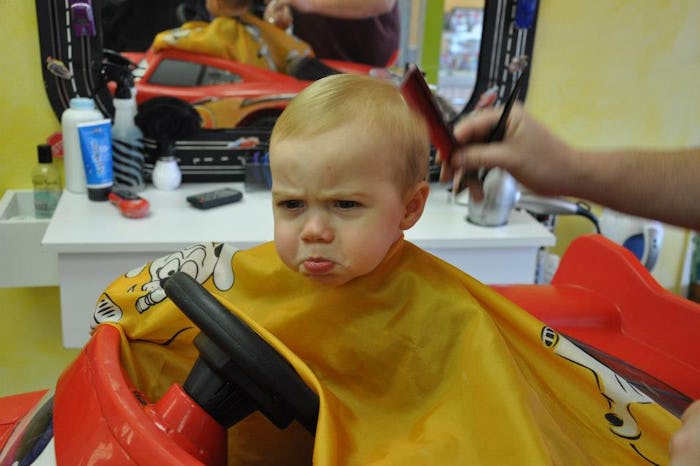 For some kids, being able to sit in a race car-shaped barber's chair makes all the difference in the world. Barber shops geared exclusively toward children are usually a bit pricier, but if you can swing it it's often worth it to avoid a total meltdown. Not only does your kid get to "drive the car" (or "ride the horse" or whatever the chair theme happens to be) but the stylists are used to fidgeting and anxious kids.