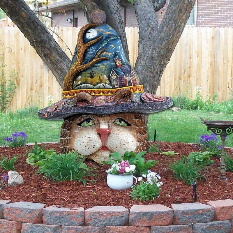 "Hey, babe? Before you drop the kids at soccer, you know what I think the front yard needs? No, not more marigolds. I was thinking maybe like a large wooden cat's head? You know, like one wearing a really elaborate and confusing witch's hat depicting trees and bats and houses? And also, if the cat could maybe look inexplicably sad? Will you maybe grab one for me at Walmart on your way home? What? Walmart doesn't carry any? Oh, okay, never mind. I think I know who might have it..."