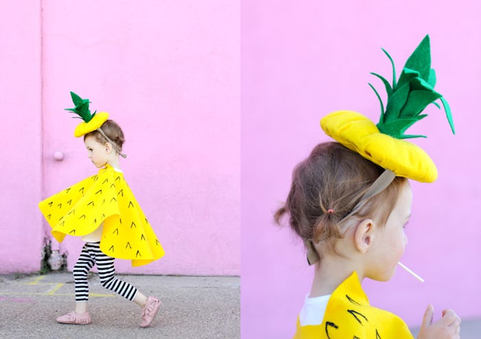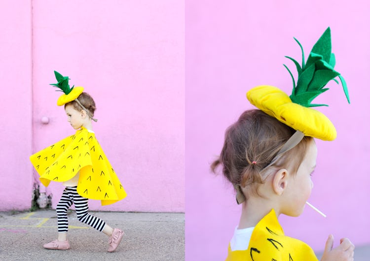 Endlessly adorable, this toddler pineapple costume requires minimal craftiness and requires only a few materials to put together. Start with a layer of basics: some striped pants and a white top if you have them, but if not, any combo will work. From there, follow the tutorial from Delia Creates using yellow felt, a pair of scissors, and a sharpie to create the most adorable pineapple cape for your little fruit. Top it all off with a pair of pineapple sunglasses to complete the look.