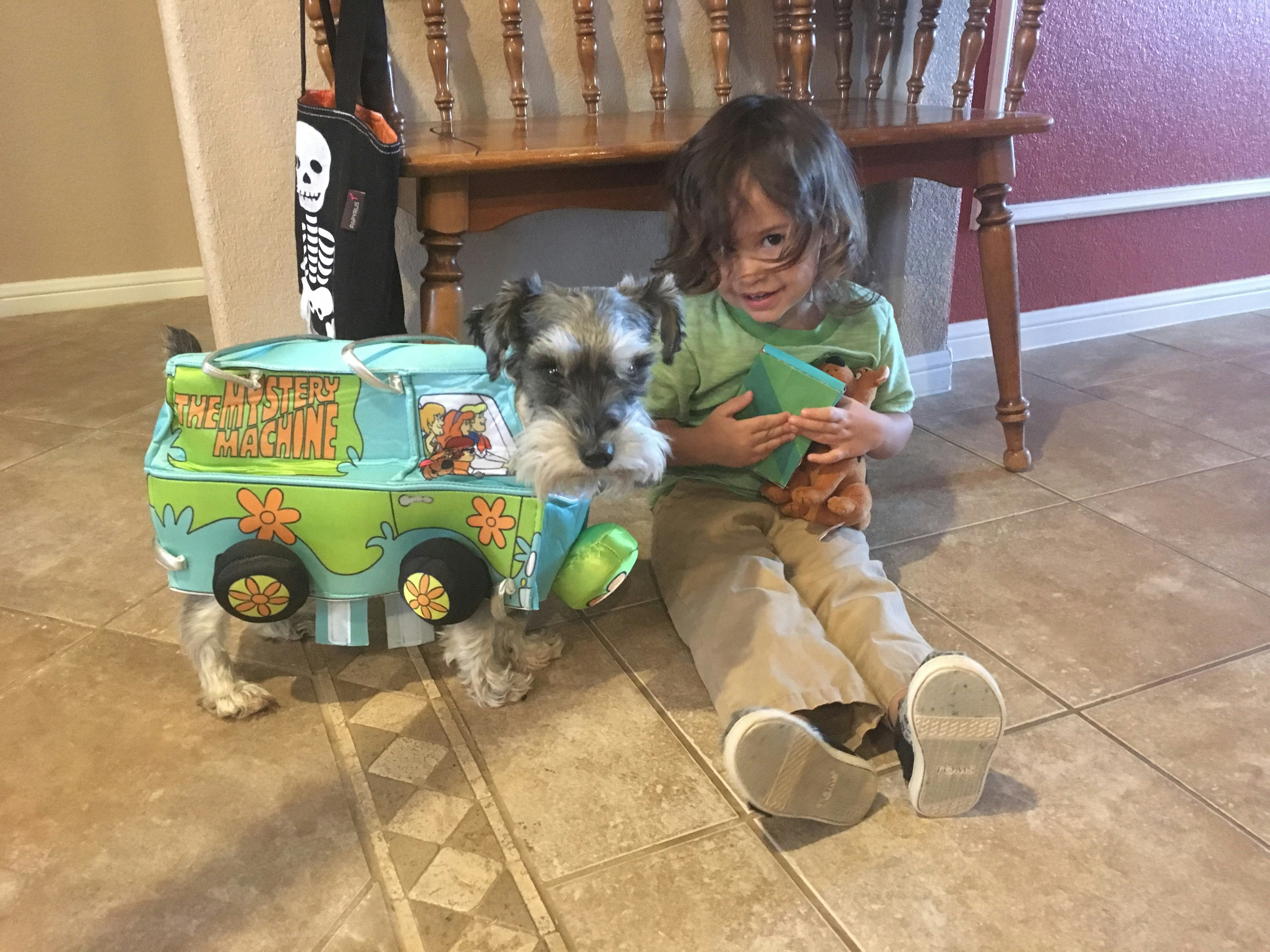 When I was a little girl, we had two German Shepherd mixes. As a baby, my mom's dog, Nina, would let me pull to a stand using her tail. My sister and I both took our first walks around the backyard with a hand each on the backs of our giant pups. We had many more dogs growing up, but I didn't get one of my own until I was 30. I adopted my mini-Schnauzer, Sheriff, when I was living in Honduras and brought him home with me. He was 3 when my daughter was born, and he's loved her from the beginning. He's always been extremely tolerant of tail- and ear-pulling, as well as hugs and kisses. Now that she's bigger, though, they're a lot more interesting to each other as playmates.