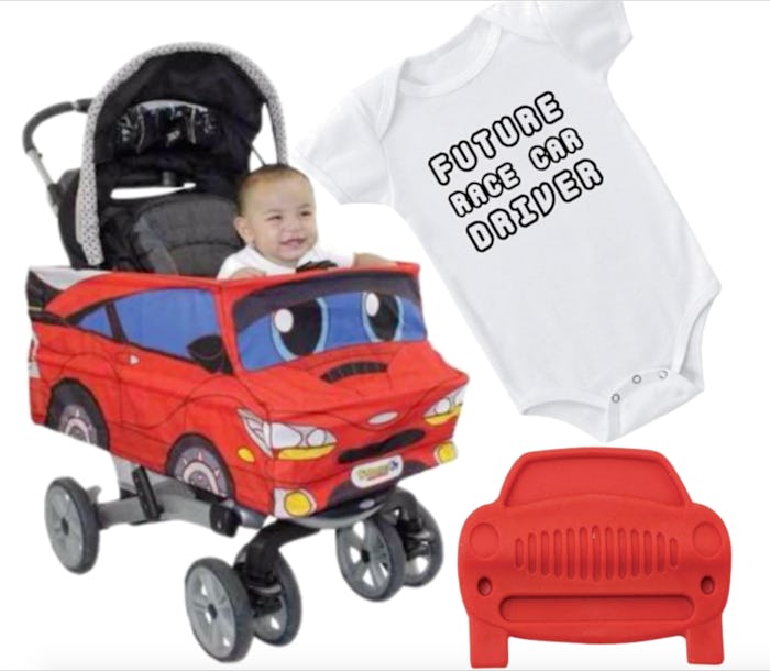 Race Car Stroller Costume, $45, Stroller Costume | Race Car Driver Onesie, $12, Amazon | Red Race Car Teething Aid, $19, Amazon