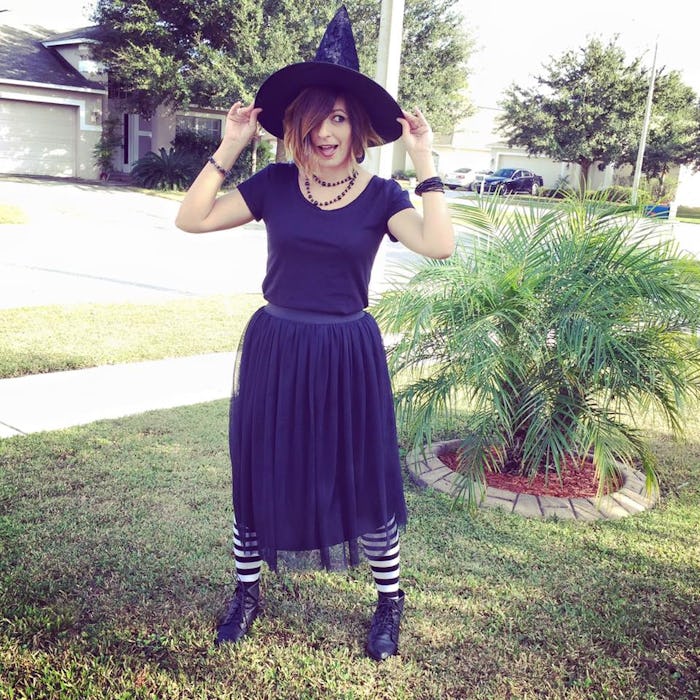 I've been different versions of this witch at least 10 times. It's super easy to put together and screams Halloween. Start with a black long sleeve shirt ($9), a black skirt ($17), a witch's hat ($2), striped socks ($8), and a straw broom ($5).