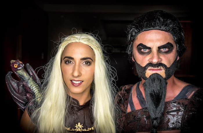 Sure, Dany and Drogo costumes have been Halloween mainstays for a while. But this year, it's all about that sweet fire and ice. Granted, this costume could get elaborate (and expensive) easily, but there's still a way to keep everything low-key. For the Mother of Dragons, get a dress with cloak, long blonde wig, and Targaryen silver pendant. For Jon, a big medieval cape, curly black wig, and a long costume sword will be perfect.