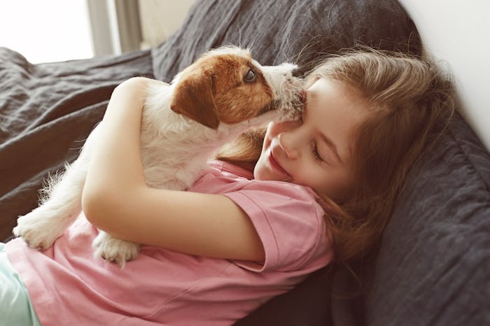 Although dogs aren't capable of feeling the varying shades of love that we do, "they are able to experience 'love,'" Jennifer Freeman, DVM, tells Romper. Freeman, the resident veterinarian for PetSmart, adds, "Both dogs and cats release the brain chemical oxytocin — the hormone that makes you feel love — when they interact with each other and with humans."