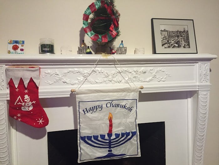 Our menorah is a piece of vinyl that unfurls to reveal little pockets where you place the velcro candles, adding one each night. It hangs under a mini fake tree, perched on our mantle, and at the end of the holiday season, I roll it up and put it away. No silver to polish or leftover candle wax to scrape. If celebrating both Chanukah and Christmas feels like too much work, take it from this lazy mom: it’s totally doable.