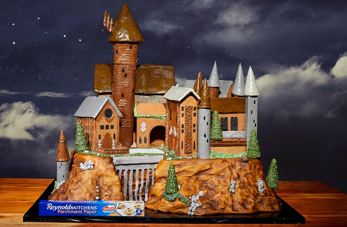 Uh, can you say Accio Hogwarts gingerbread castle to my front door? I want to look at it on display all year round. I think Hermione, Ron, and Harry would be very proud of this rendition of their beloved school. The house took around 30 hours to make — i.e., three days — with three folks working on it full time, according to the Reynolds Kitchens representative. And at approximately 48”w x 36”l x 36”h, this 60-pound house is made up of a “mix of gingerbread, cake, crispy rice treats, and fondant to make the different shapes in the house,” she says. It was made by using the Reynolds Kitchens Parchment Paper with SmartGrid®, ensuring every wall was precisely measured.