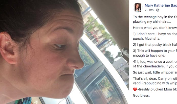 Mary Katherine Backstrom, a prominent blogger tackling all things motherhood at Mom Babble, went viral after posting about a teen snapping a photo of her plucking a chin hair in a Starbucks parking lot. In a Facebook post that's been shared thousands of times, Backstrom penned a message to the teen, writing: "To the teenage boy in the Starbucks parking lot who just recorded me plucking my chin hairs...Here’s what you don’t know... I don't care. I have no shame. And sorry, but I beat your upload to the punch." (And don't worry fellow mamas, as she shared on Facebook, she "got that pesky black hair.")