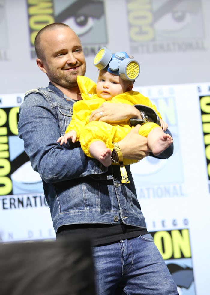 Even though it will likely be a long time before baby Story will actually be allowed to see her dad in action in episodes of Breaking Bad, Paul and his wife were definitely down to involve their baby daughter in the reunion fun, giving her her first taste of Comic-Con cosplay by dressing her in a yellow jumpsuit and mask, similar to what her famous dad often wore in his on-screen meth lab. And though that might not exactly be most parents' go-to costume choice, the result was both adorable and completely hilarious. As he and the rest of the show's cast made their way to the stage, Paul brought Story out on-stage briefly, according to Page Six, and unsurprisingly, the crowd totally loved it.