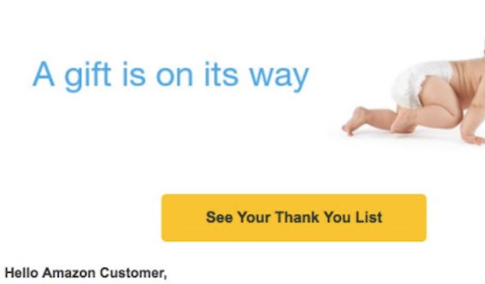 As reported by BuzzFeed, "Hello Amazon Customer," the erroneous emails read. "Someone great recently purchased a gift from your baby registry!" The article on the situation revealed that, when the link in the email is clicked from a smart phone, users are led to the Amazon app where's they're invited to start a baby registry. One user who does have an Amazon baby registry reported that clicking on the email's link just sent her to a blank page. In response, The Verge recommends that users delete the emails, and avoid clicking on them altogether, despite any curiosity that might threaten to take over.