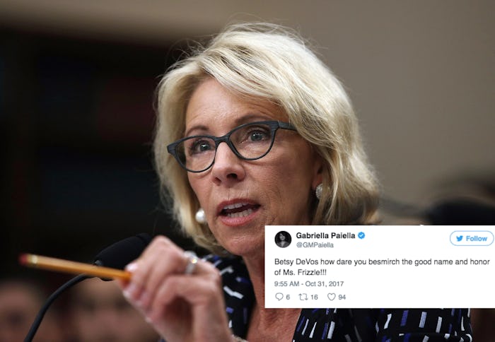 People on Twitter made it very clear that DeVos' choice for a Halloween costume was not a popular one. Twitter user @silverlining8D even tweeted, "NO SHE DID NOT. Betsy DeVos is not worthy to even watch Ms. Frizzle on TV. 😷 #halloweenfail." Harsh.