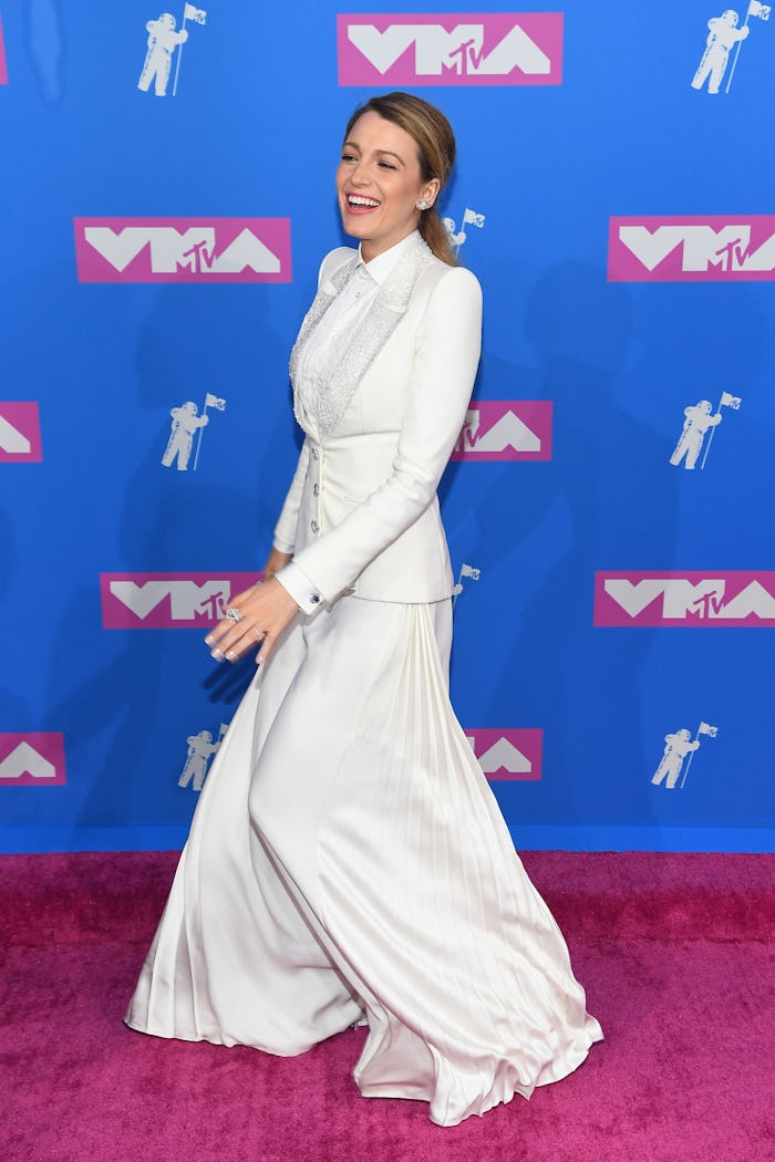 At the live MTV award show, Lively looked chic as always, strutting the red carpet in a tailored white sequined tuxedo-style blazer, flowing pants, and an oxford shirt. And along for the ride was her beaming mom, Elaine Lively, according to ELLE, looking lovely in an opposing black pantsuit. Aww!