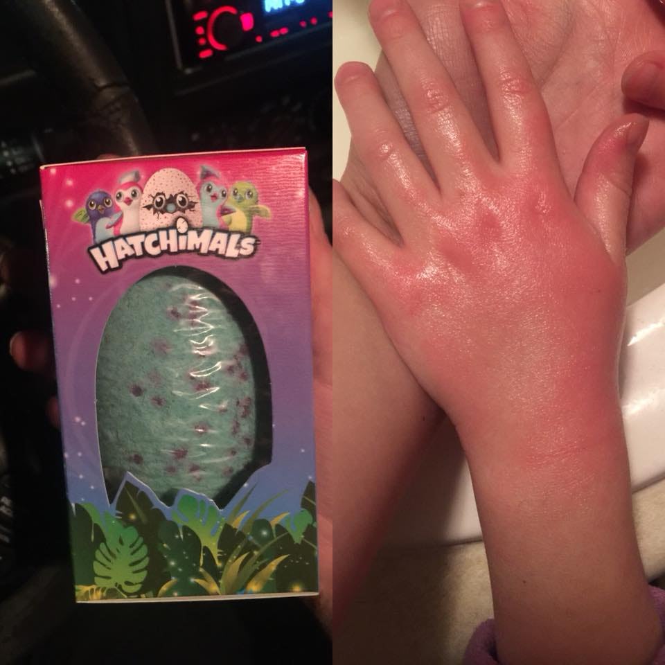 According to a now-viral Facebook post, a child experienced chemical burns after taking a bath with a Hatchimals bath bomb. As the post further explained, the child's reaction was confirmed as a chemical burn by a doctor, and she had not experienced any reaction from other branded bath bombs before. Information about the particular batch of bath products is provided in a photo, and the mother who posted about the product suspects this particular batch will soon be subject to recall as there have been other complaints made.