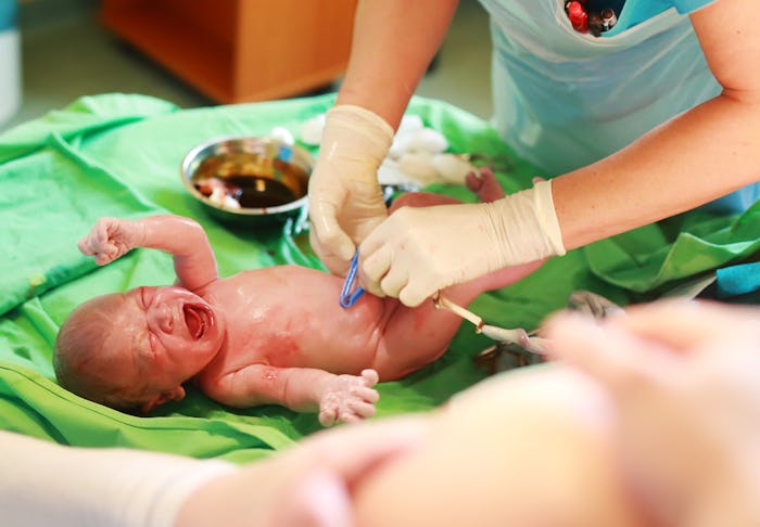 Once you have given birth, your doctor may choose wait a few minutes before cutting the cord in order to let the umbilical cord bring more blood to the baby and increase his or her oxygen supply. According to Family Education, the cord will then be clamped at one centimeter and four centimeters from the baby's belly, then cut between the two clamps to minimize, well, the mess.