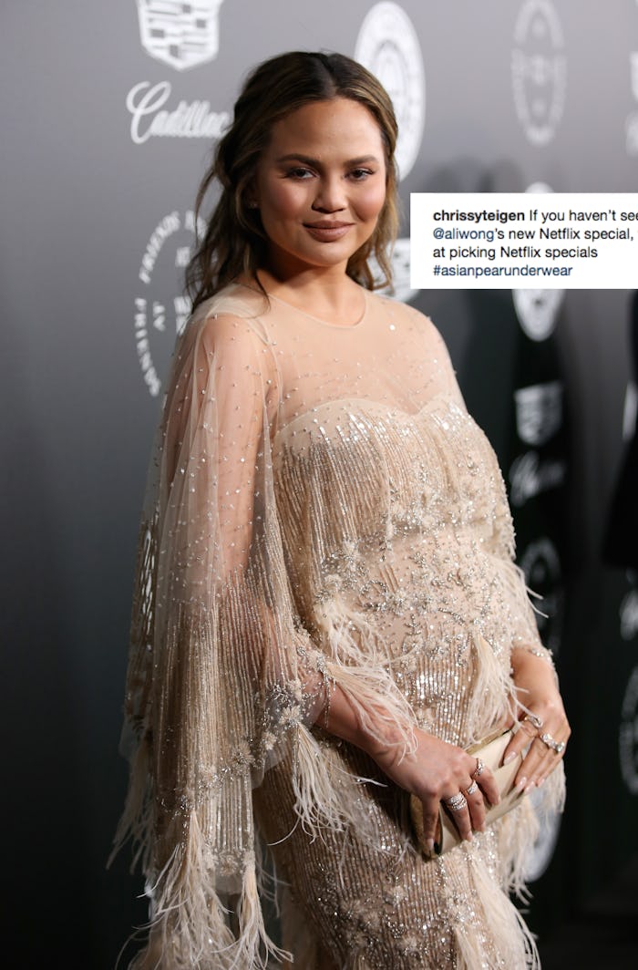 The truth, of course, is that Teigen is a model, and as such, still somehow manages to pull this look off. But it's still a totally realistic portrayal of what the postpartum days are really like, and how unglamorous it actually feels (I mean, why does no one warn you in advance that your body is about to totally betray you in every and all ways?). Perhaps the best part of Teigen's post though? The caption, which perfectly referenced the brilliance of comedian Ali Wong's new Netflix special, Hard Knock Wife, in which Wong compares the mesh undies you get at the hospital after giving birth to the "same material that they package those fancy Korean pears in," according to Vice (Teigen is even holding a wrapped pear in the pic, which is so amazing).